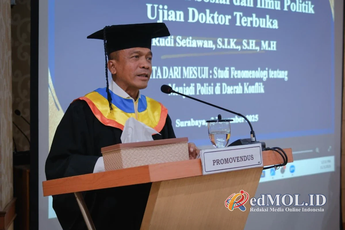 Kapolda Jabar, Irjen Rudi Setiawan menjalani sidang disertasi berjudul 'Cerita dari Mesuji: Studi Fenomeno logi tentang Menjadi Polisi di Daerah Konflik' di Universitas Airlangga, Senin (3/11/2025). Irjen Rudi Setiawan dengan penuh percaya diri di hadapan para penguji yang hadir demi menyabet gelar doktor memaparkan tentang menjadi polisi yang profesional, bertanggung jawab, dan berintegritas di wilayah yang penuh masalah, kekerasan masyarakatnya meluas dan melembaga, hingga keberadaan polisi tak pernah diterima sepenuhnya.