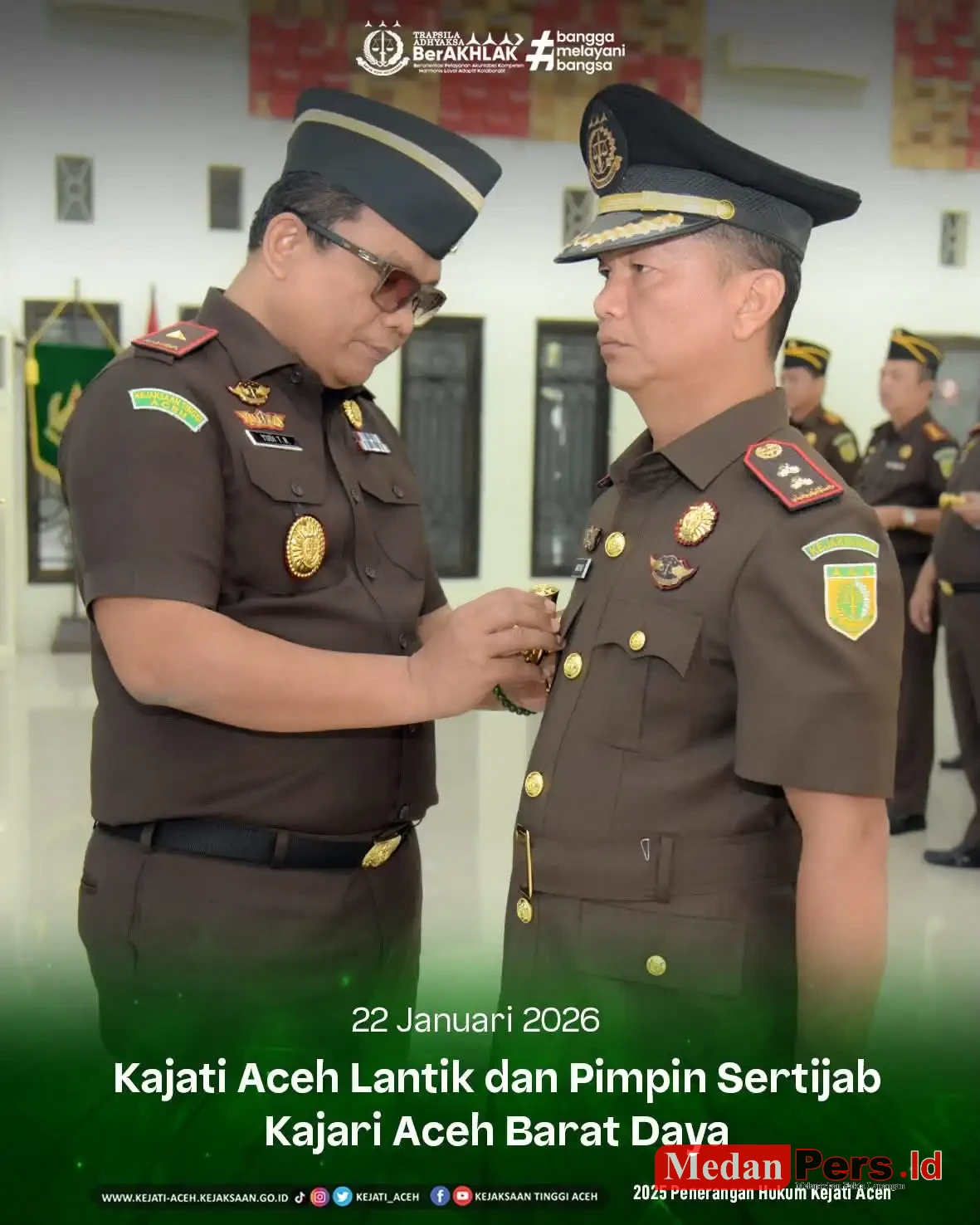 Aceh– Kepala Kejaksaan Tinggi Aceh, Yudi Triadi, S.H., M.H., secara resmi melantik dan mengambil sumpah jabatan Kepala Kejaksaan Negeri Aceh Barat Daya Kardono,S.H.,M.H., yang berlangsung khidmat di Aula Serbaguna R Soeprapto Kejati Aceh, Kamis (22/1/2026). Pelantikan ini dirangkaikan dengan serah terima jabatan dan dihadiri oleh jajaran pimpinan Kejaksaan Tinggi Aceh serta para Kajari Se-wilayah Aceh.