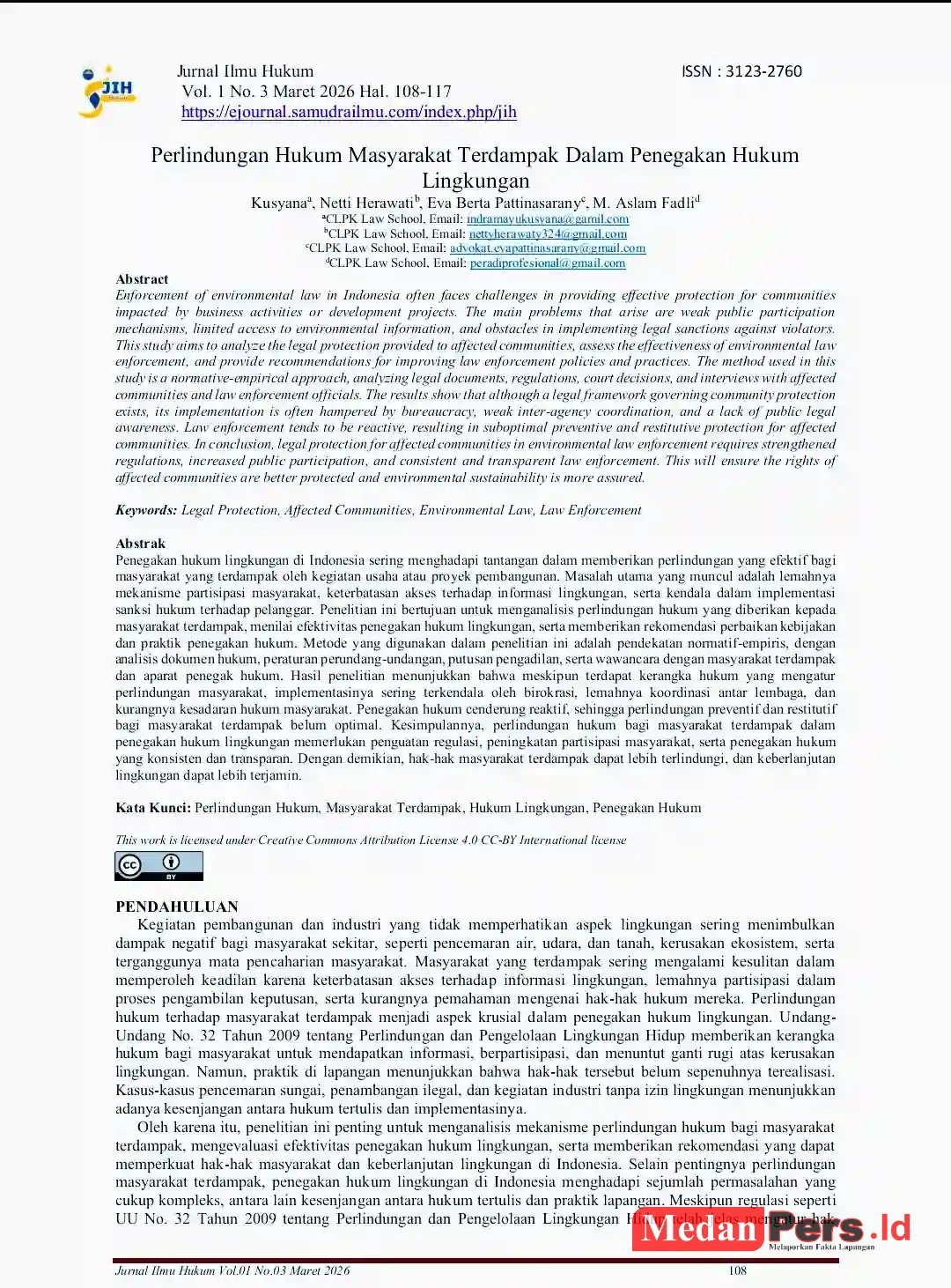 Medan Pers.id | Peneliti hukum lingkungan Indonesia, Netti Herawati, bersama beberapa koleganya dari CLPK Law School, mengungkap lemahnya perlindungan hukum masyarakat terdampak dalam praktik penegakan hukum lingkungan di Indonesia. Riset ilmiah mereka yang berjudul “Perlindungan Hukum Masyarakat Terdampak dalam Penegakan Hukum Lingkungan” terbit dalam Jurnal Ilmu Hukum Vol. 1 No. 3, Maret 2026 (halaman 108–117) dan tersedia di portal e‑journal: ejournal.samudrailmu.com.